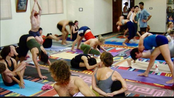 Take another look at the pictures above- notice that one picture has everyone in the same posture or movement, with the teacher sitting. This is most likely a teacher-led class, with everyone following the vinyasa- count, posture names and direction. The other picture has the same teacher out among the group, and everyone is somewhere different in their practice. This latter photo is what Mysore Style, or self guided practice commonly looks like.** If you’re musically inclined,think practicing with a band (led class) and practicing your band-work yourself.(self- guided practice). It may look like some chaos, but even when everyone around you is doing something different, there is a unifying spirit of energy and concentration going on.